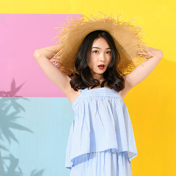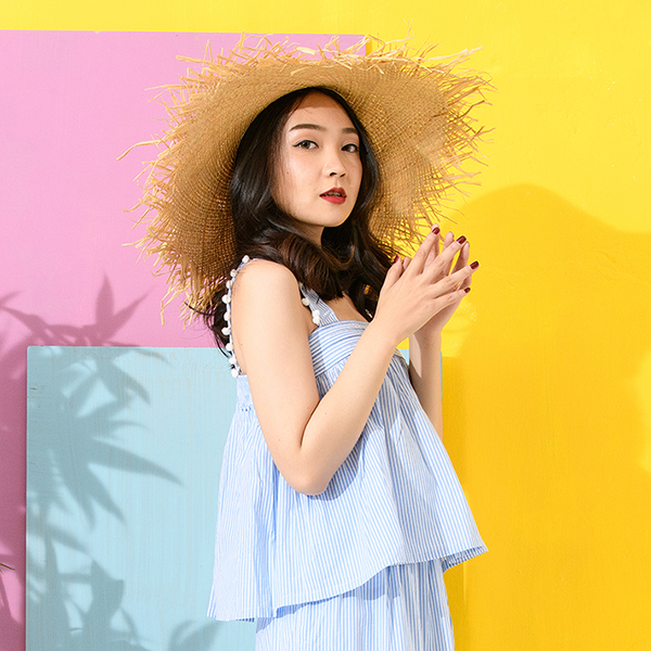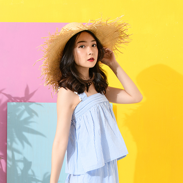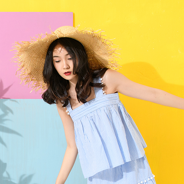 享受夏季湖畔風情,雙色條紋、綠葉繽紛圖樣帶出清爽舒適,無袖與衣身抽縐款型、肩部小圓球裝飾,活潑氣息十足!