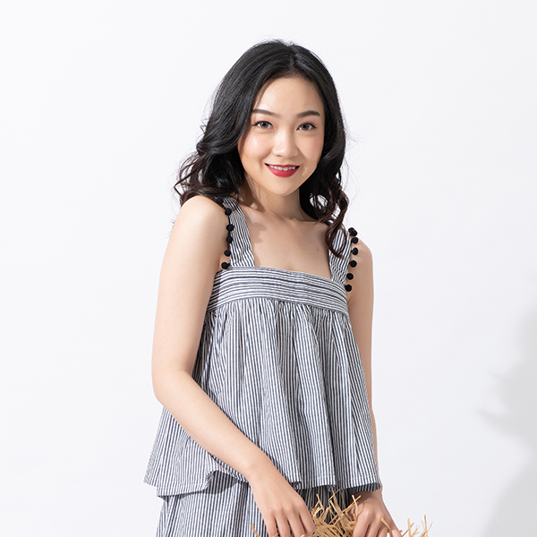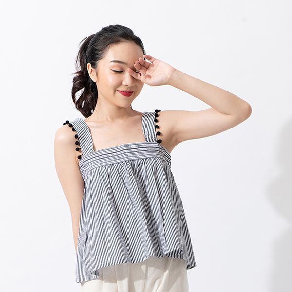 享受夏季湖畔風情,雙色條紋、綠葉繽紛圖樣帶出清爽舒適,無袖與衣身抽縐款型、肩部小圓球裝飾,活潑氣息十足!